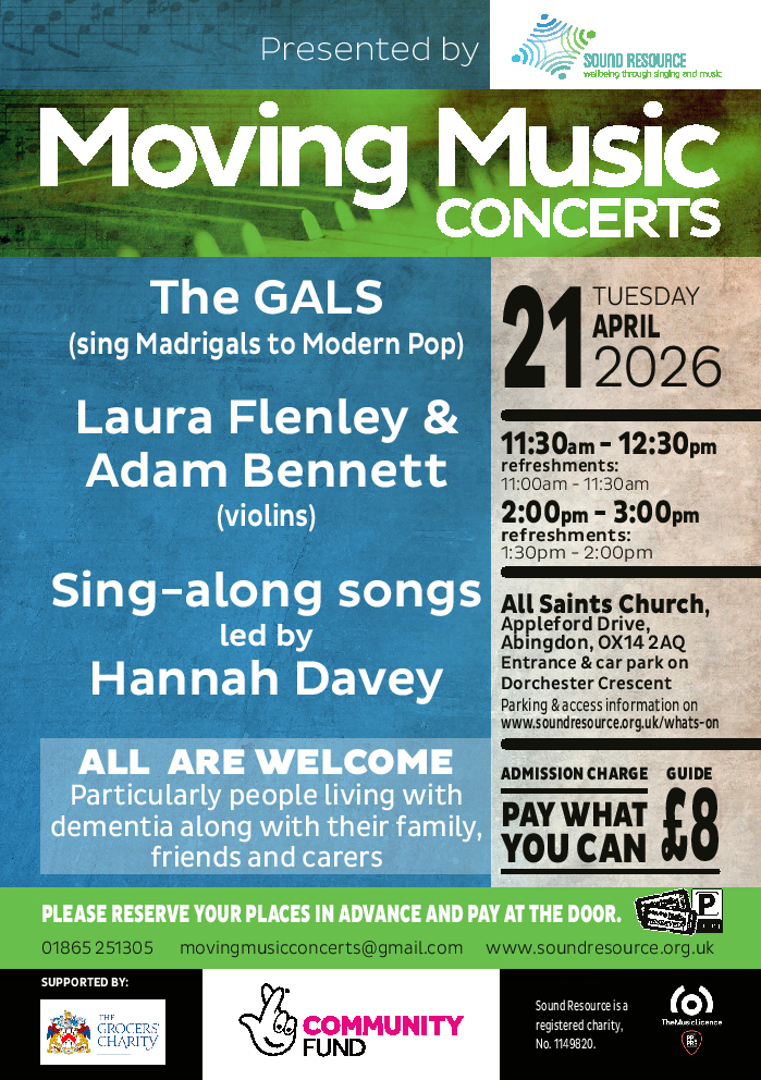 The next Moving Music Concert at All Saints Church, Abingdon and is on Tuesday 21st April 2026, at 11.30-12.30 and 2.00-3.00pm